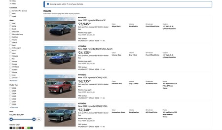 En el país norteamericano, Amazon ha creado su propio espacio para la industria automotriz con Amazon Autos, una sección que reúne inventario de múltiples concesionarios y marcas. La captura actual muestra un amplio catálogo en el que conviven vehículos de distintos fabricantes, ofrecidos por distintos concesionarios y vendedores especializados. Esta estructura encaja con la estrategia de Amazon de reforzar su presencia en el sector, una línea que ya abrió con la acuerdo firmado con Hyundai en 2023 para facilitar la compra online de coches nuevos.