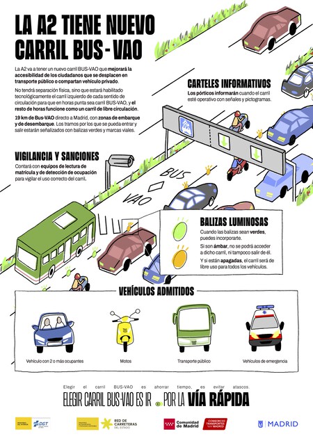 Un nuevo autobús HOV. La gran novedad de este nuevo Bus-VAO es que Es un carril sin separación física y se activará puntualmente, tanto diariamente durante las horas de mayor actividad de entrada y salida de la capital como durante operativos especiales o durante el fin de semana. Es decir, el conductor encontrará los tres carriles habituales pero cuando empiece a circular, el de la izquierda pasa a ser Bus-HOV.