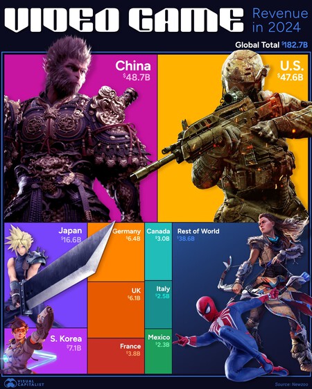 Dos gigantes. En primer lugar, el gráfico preparado por Capitalista visual se ha llevado a cabo teniendo en cuenta los datos de Newzoo. Es una empresa que analiza el estado de la industria y, aunque los números pueden fluctuar si tomamos otras fuentes, algunas de las compañías más grandes de este sector trabajan directamente con Newzoo. Dicho esto, debemos destacar los dos mercados gigantes de videojuegos.