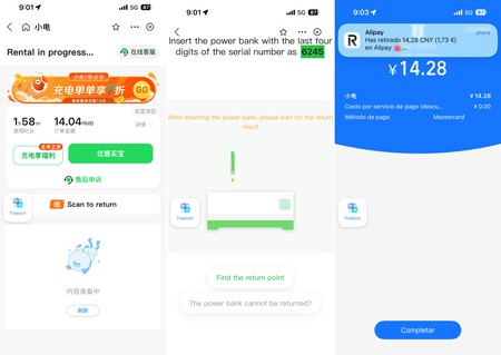 El precio es de 0,12 yuanes por minuto (unos 0,014 euros), pero como no tengo cuenta bancaria en China, tuve que pagar un depósito de 99 yuanes (unos 12 euros). Tan pronto como pagué, la aplicación me dijo qué powerbank tenía que quitar y la propia estación hizo que el LED de batería correspondiente parpadeara. Para cargar.