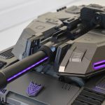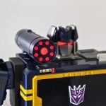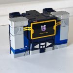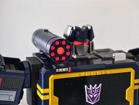 onda sonora tiene 84 microchips y 28 servomotores de alta precisión. El acabado reproduce fielmente el diseño del lugarteniente de los Decepticons, no sólo por la tapa superior donde normalmente alojaríamos la cinta de casete, sino por el cañón superior que aparece de la nada y el arma que se convierte, por supuesto, en una pila.