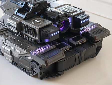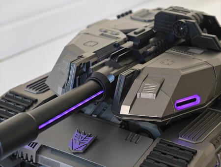 Megatron, como todo fan de Transformer sabrá, toma la forma de un tanque, y aquí no podría ser menos. El animatronic cuenta con 112 luces LED con detalles en rojo y morado, ruedas inspiradas en tanques reales y un acabado metálico brillante. Eso está en el exterior, pero En su interior cuenta con 118 microchips y 36 servomotores de alta precisión que la hacen no sólo moverse, porque se mueve, sino también transformarse. Creo que un vídeo le hace más justicia que las fotos.