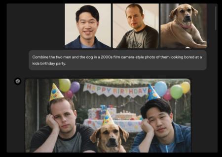 «Combiné a los dos hombres y al perro en una fotografía estilo cine de los años 2000 de ellos luciendo aburridos en una fiesta de cumpleaños infantil».