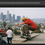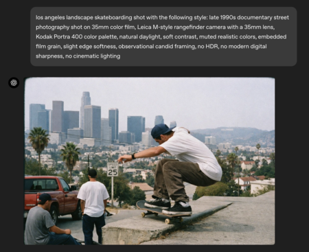 «Paisaje en patineta de Los Ángeles, fotografiado en el siguiente estilo: fotografía callejera documental de finales de los 90, filmada con película en color de 35 mm, cámara telémetro estilo Leica M con lente de 35 mm, paleta de colores Kodak Portra 400, luz natural, contraste suave, colores realistas apagados, grano de película incrustado, ligera suavidad de los bordes, encuadre de observación espontánea, sin HDR, sin nitidez digital moderna, sin iluminación cinematográfica».