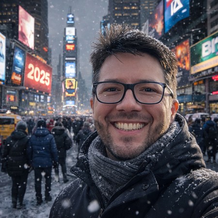 «Crear una imagen de este hombre, pero en Time Square, en Nueva York, con ropa, looks, entorno, etc., que sean creíbles para el invierno de 2025».