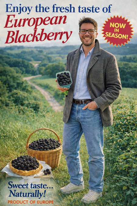 «Utilice la imagen de este hombre para crear un anuncio europeo de moras de los años 90. Representa al sujeto de cuerpo entero».