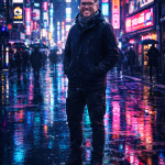 «Situa a esta persona de cuerpo entero en una ciudad japonesa durante una noche lluviosa, con neón, reflejos en el suelo y estética cyberpunk.»