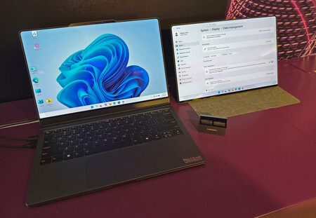 La computadora portátil parece un dispositivo ThinkBook normal cuando está plegada. Pero no, porque cuenta con una pantalla secundaria que va anclada a la principal, aunque en la parte trasera. el portatil Puede proyectar contenido hacia adelante y hacia atrás.dos personas podrían jugar a hundir la flota, por ejemplo. O utilizar esa pantalla secundaria para trabajar en paralelo: el panel se desmonta.