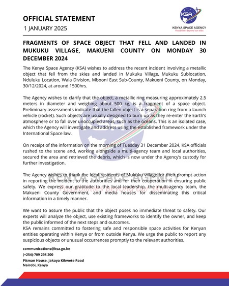 Apenas 48 horas después de recoger los restos, la Agencia Espacial de Kenia ofreció una primera explicación. En su comunicado del 1 de enero de 2025La agencia indicó que, según evaluaciones preliminares, la pieza correspondía a un fragmento de un objeto espacial, específicamente un anillo de separación del vehículo de lanzamiento. Fue una conclusión relevante, pero parcial. La agencia no vinculó el objeto con ningún cohete específico y calificó el incidente de aislado, al tiempo que anunció la apertura de una investigación en virtud de los marcos legales internacionales que regulan las actividades en el espacio.