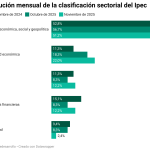 En cuanto a la clasificación sectorial, el análisis mostró cambios significativos en la composición de las noticias alimentadas por el indicador. Fedesarrollo informó que en noviembre de 2025 El 51,2 por ciento de los contenidos monitoreados corresponde a política económica, social y geopolíticaseguido de actividad económica (22,0%), variables financieras (12,2%), otros (12,2%) y seguridad (2,4%).