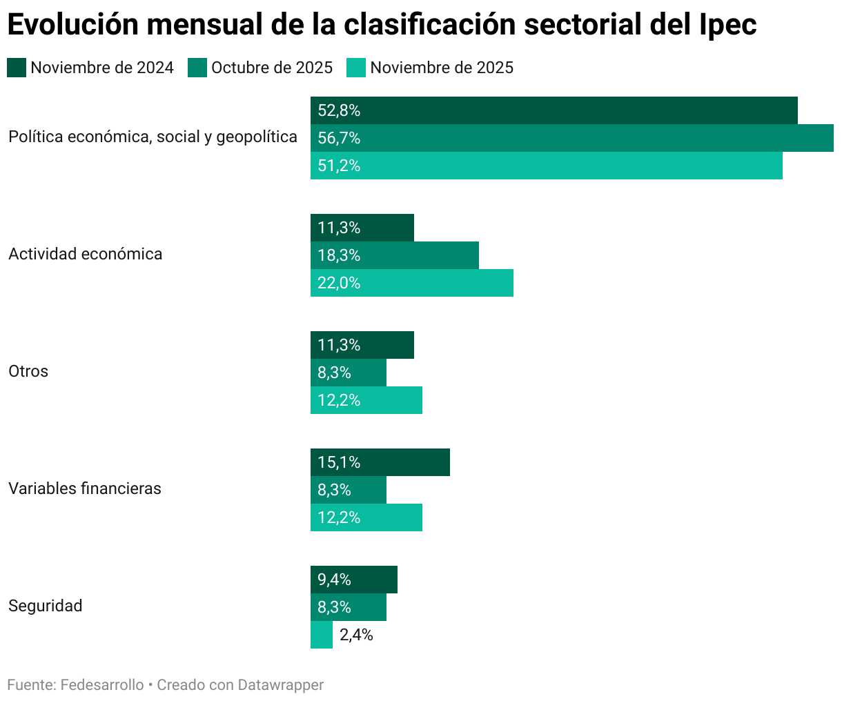 Comparando los resultados con noviembre de 2024, Fedesarrollo afirmó que las categorías que ampliaron su participación fueron la actividad económica, con un crecimiento de 10,7 puntos porcentuales, y otras, con un aumento de 0,9 puntos porcentuales.