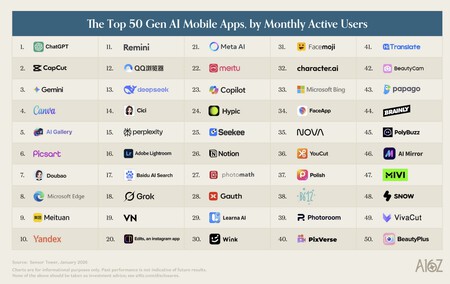 Estados Unidos domina. En esa lista el dominio de las apps de compañías americanas es claro, y sólo la china DeepSeek se cuela en la lista del top 10. Aquí ChatGPT domina el ranking con Gemini y Canva completando el podio, pero sorprende ver la relevancia de Grok, por delante de Claude.