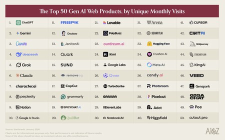 La sociedad de capital riesgo Andreessen Horowitz ha preparado su ranking ya tradicional con las 100 principales aplicaciones de IA para usuarios finales del mundo. Hay muchos previsibles en los primeros puestos, pero nos sorprende porque entre los 15 primeros se encuentra nada menos que freepikla plataforma creada por la startup malagueña del mismo nombre.