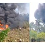 Las imágenes muestran una gran nube de humo, aún visible desde lejos, junto con lo que parecen ser fragmentos del avión en llamas.